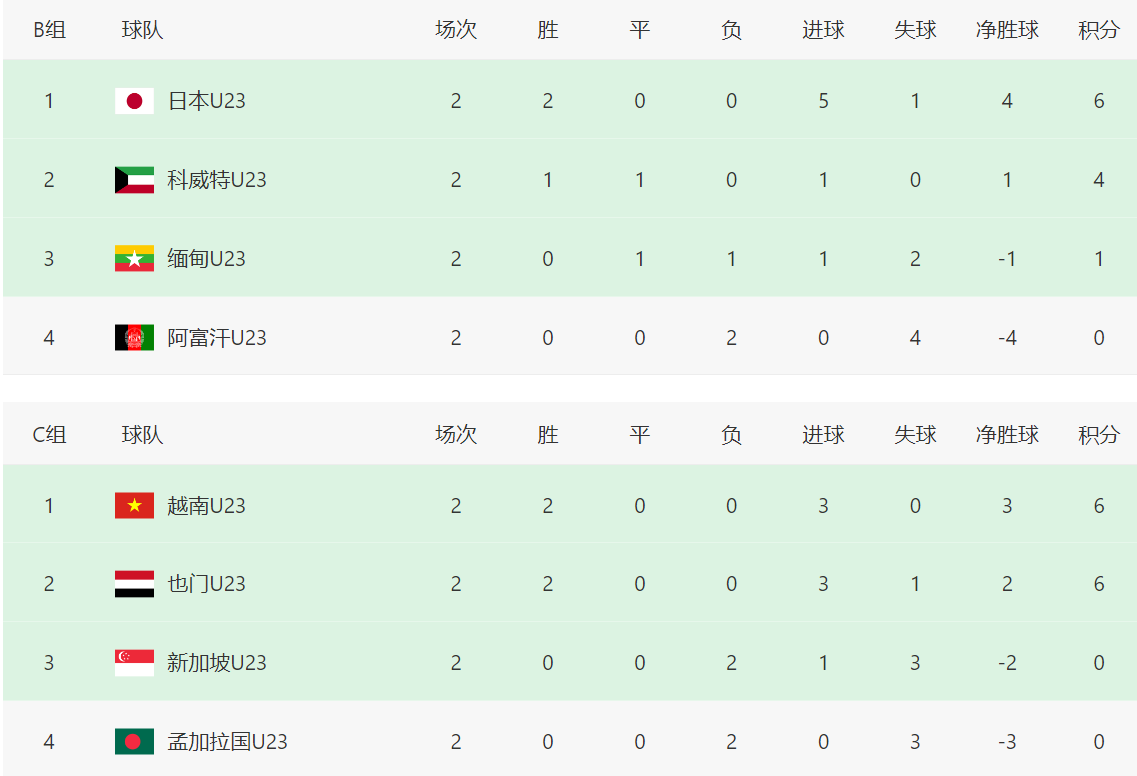 C组:越南队6分、也门队6分、新加坡队0分(提前出局)、孟加拉队0分(提前出局)
